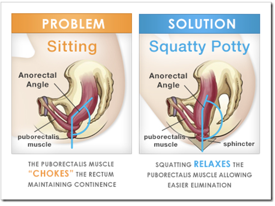 ท่านั่งยอง ๆ สะโพกกับลำตัว เรา จะทำมุมเป็นลักษณะมุมแหลม (35 องศา) ต่างกับท่านั่งชักโครกที่ขากับลำตัวของเราจะทำ เป็นลักษณะมุมฉาก (90องศา)  ซึ่งมุมของลำไส้ตรงมันค่อนข้างจะพักมากกว่า คนที่มีปัญหาเรื่องท้องผูกอุจจาระแข็งหรือมีปัญหาในการเบ่ง ถ้าเราทำมุมของลำไส้ให้ตรง ให้มันเปิดมากขึ้น ก็จะทำให้การขับถ่ายมันทำได้สะดวกง่ายมากขึ้น