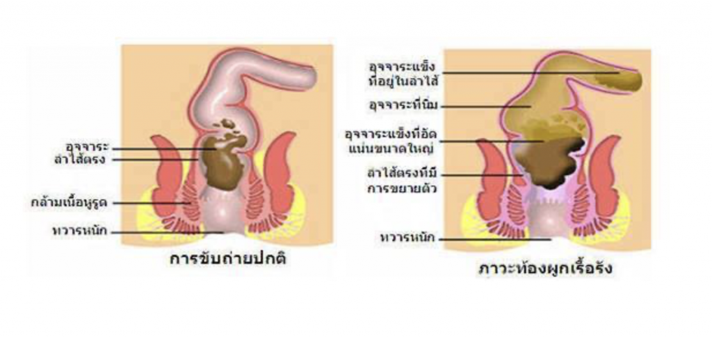 ลักษณะลำไส้ที่มีการขยายตัวมากๆ เป็นเวลานาน เพราะมีอึสะสมจนเป็นก้อนใหญ่และแข็งจากการอั้น ลำไส้บริเวณนั้นจะอ่อนแอไร้แรงบีบตัวทำให้ไม่ค่อยมีแรงเบ่ง และลำไส้จะไม่ส่งสัญญาณไปที่สมอง ให้สมองสั่งให้มีความรู้สึกปวดอึ